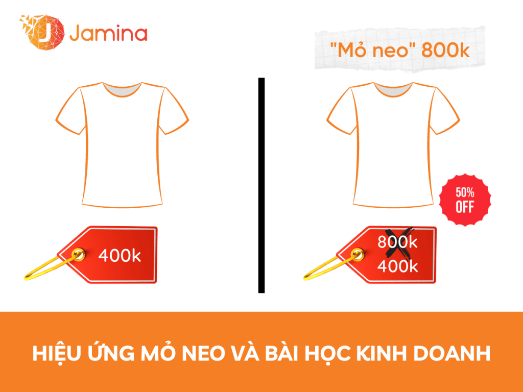 Cách 2 sẽ thu hút người mua nhiều hơn. Khách thấy họ được hời. Con số 3.000.000 đồng là một “mỏ neo” đọng trong tâm trí người dùng. Mặc dù giá trị không thay đổi nhưng bằng việc ghi giá khuyến mại, khách hàng sẽ cảm thấy mình lựa chọn thông minh hơn. Chiếc áo trong cách 2 có vẻ “xịn” hơn áo cách 1.